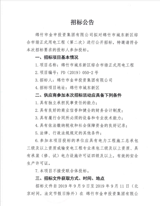 市城东综合市场正式用电工程(第二次)公开招标公告