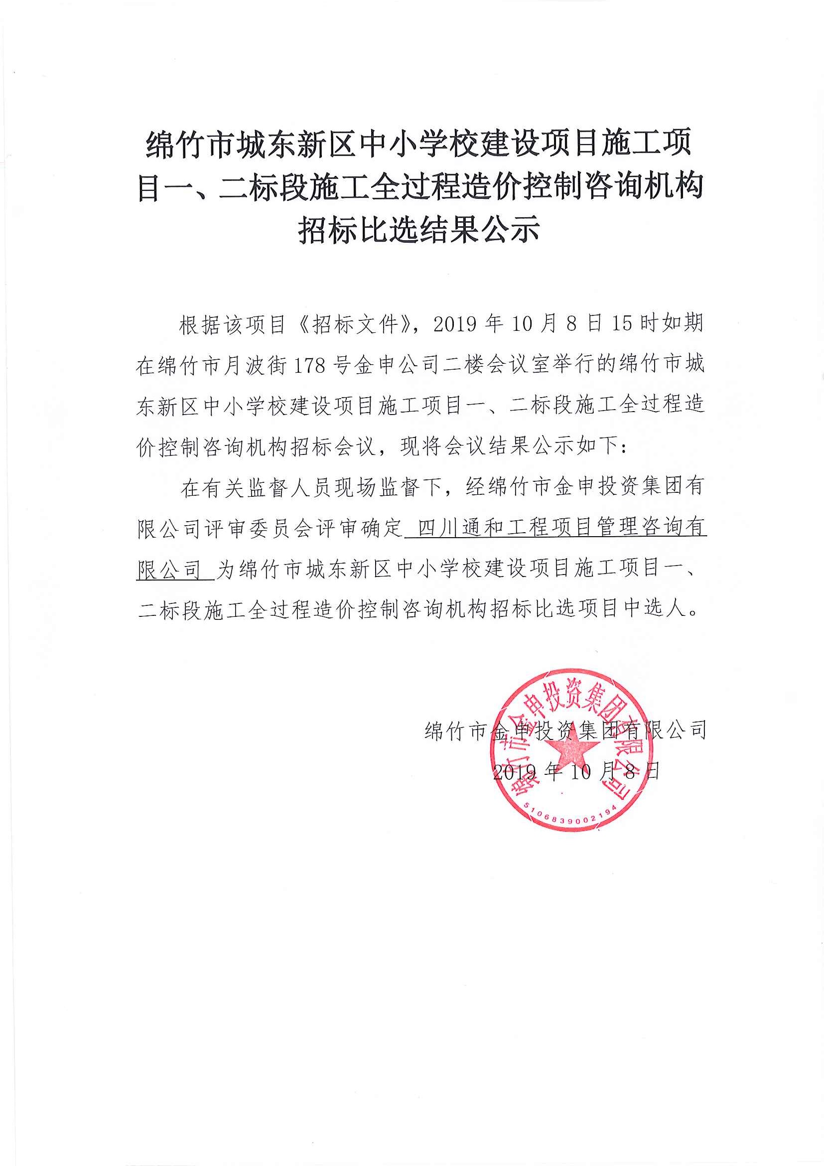 城东中小学校项目一、二标段造价控制咨询比选结果公示