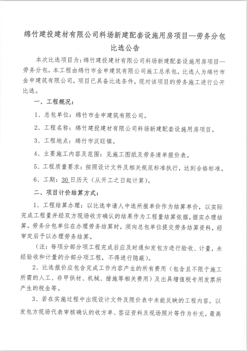 市建投建材料场新建配套设施用房项目劳务分包比选公告