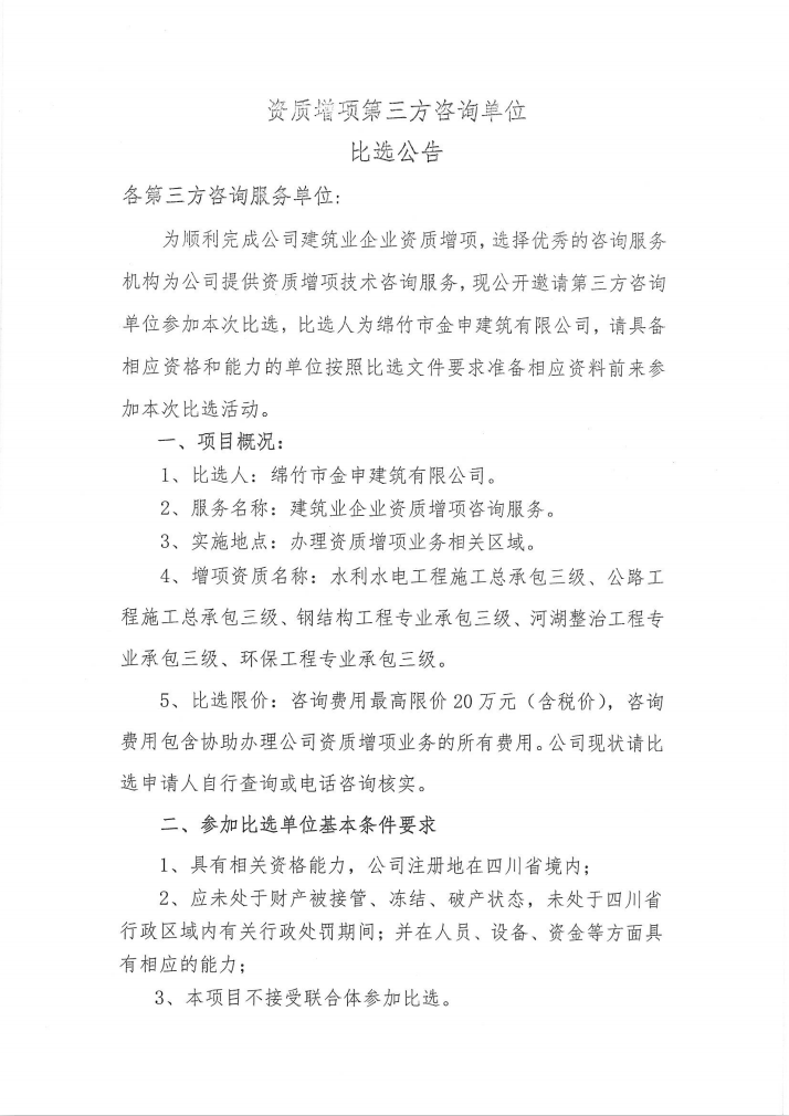 资质增项第三方咨询单位比选公告