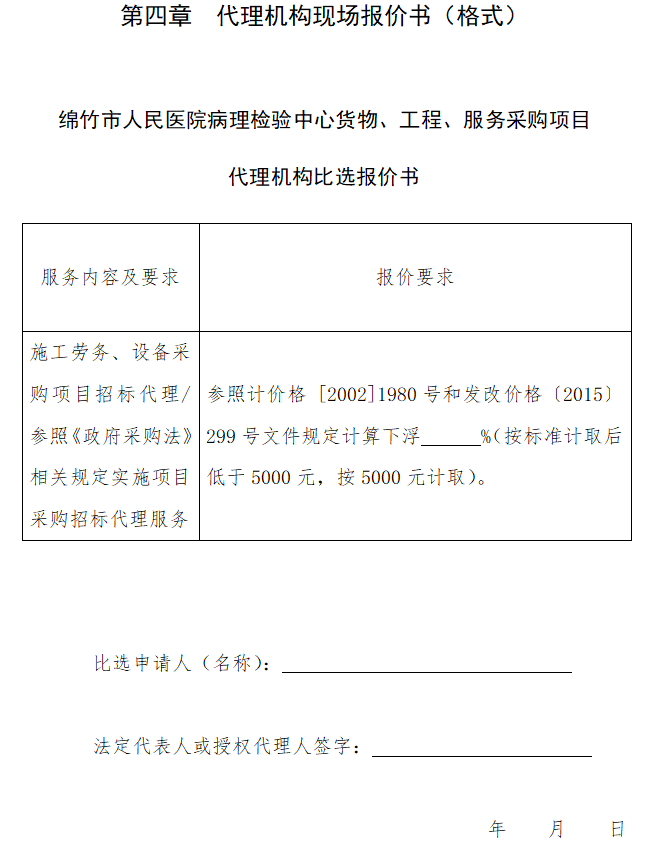4.3定于报名截止时间,在自愿到场的比选申请人代表的现场监督下,在绵竹市金申建筑有限公司公开举行比选活动,从符合资格条件且报价(下浮比例)最高的比选申请人中确定 1 个代理机构作为中选人。
