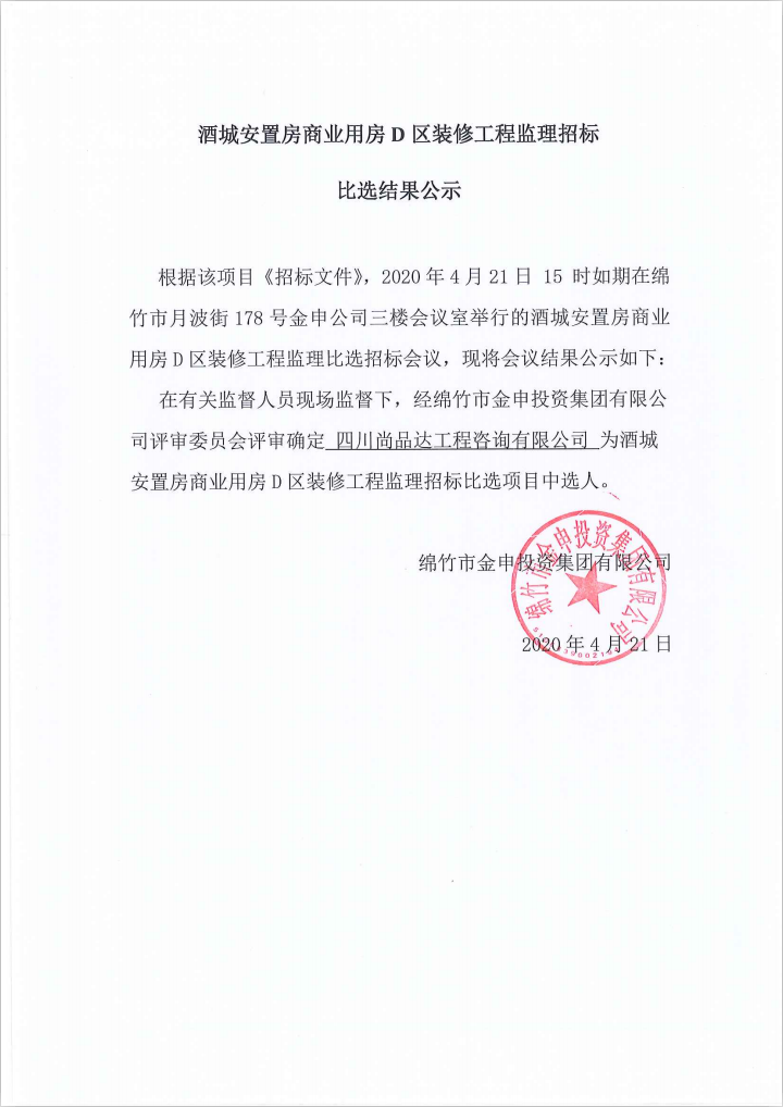 酒城安置房商业用房D区装修工程监理招标比选结果公示