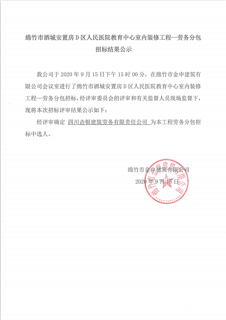 人民医院教育中心室内装修工程—劳务招标结果公示