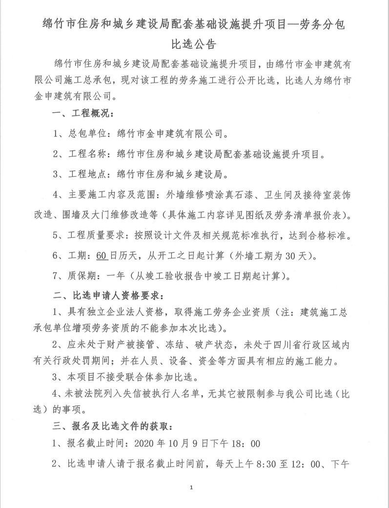 绵竹市住建局配套基础设施提升项目——劳务分包比选公告