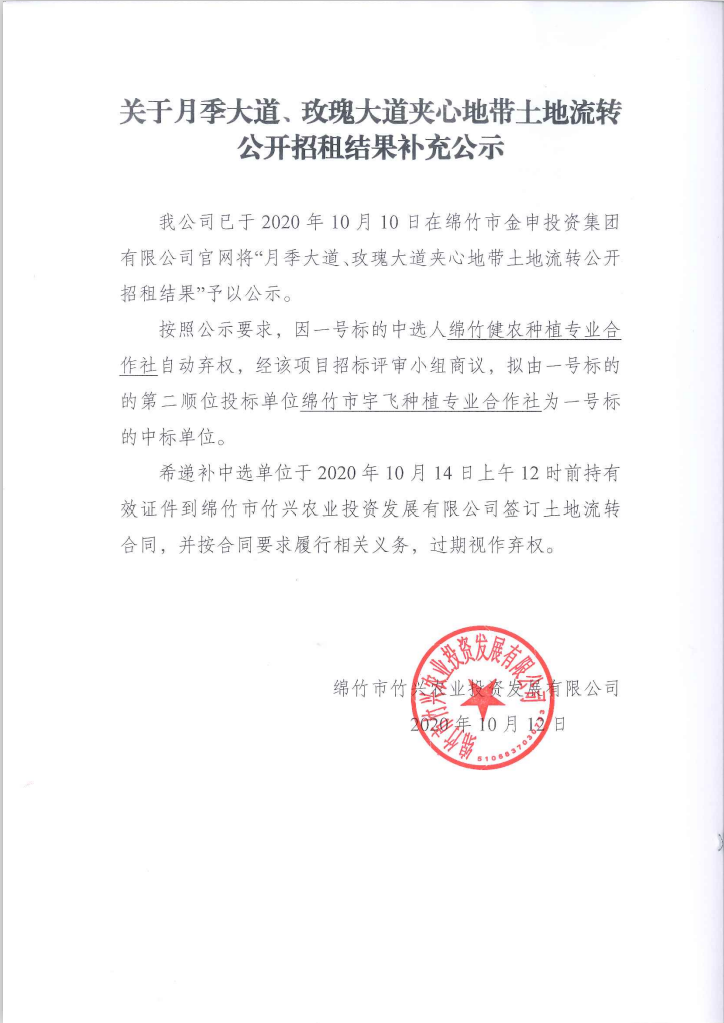 月季、玫瑰大道夹心地带土地流转公开招租结果补充公示