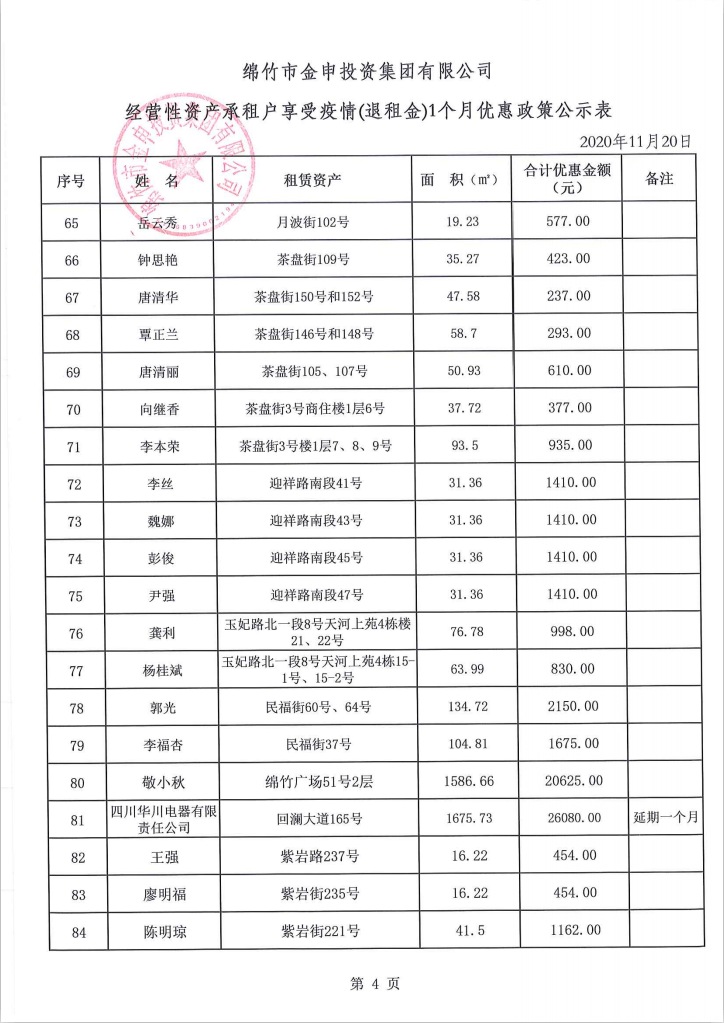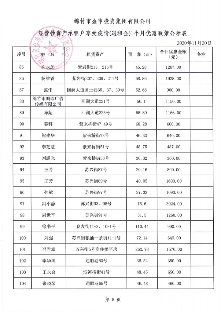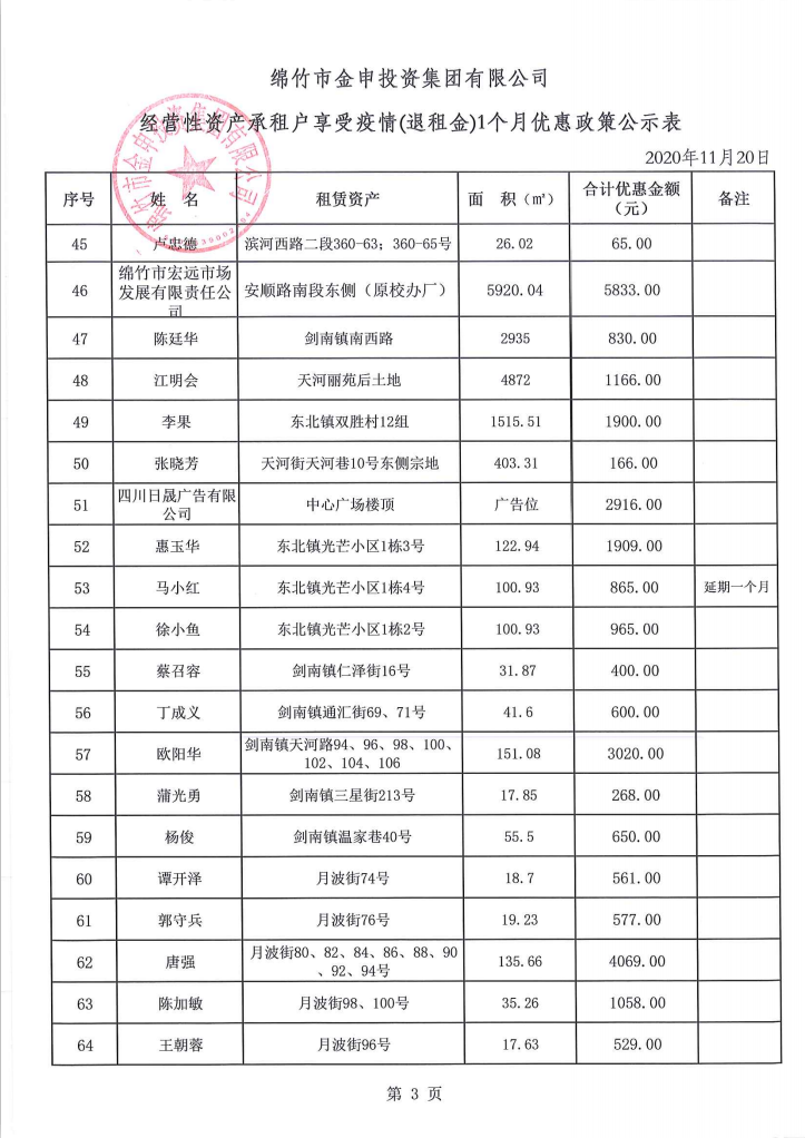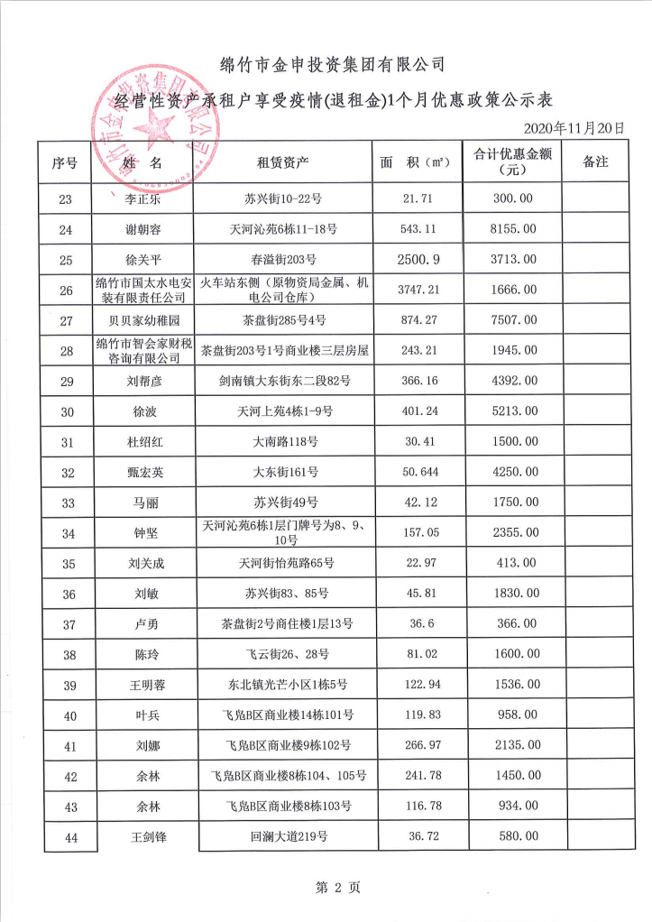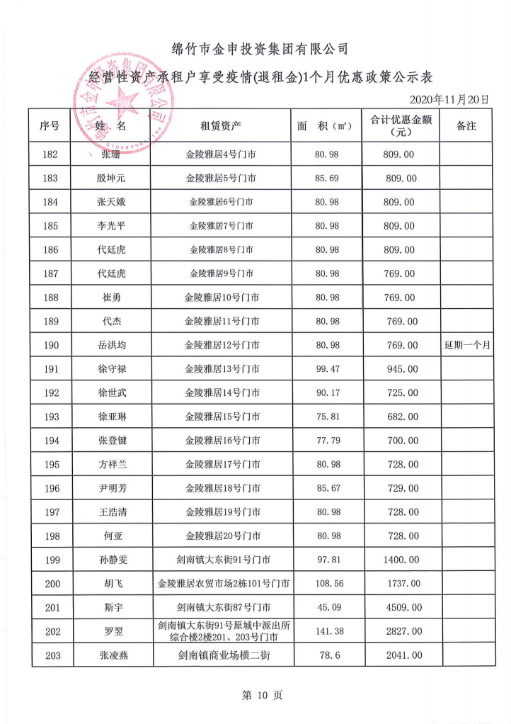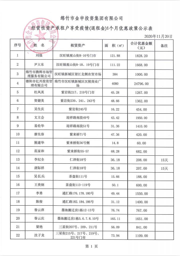 经营性资产承租户享受疫情(退租金)一个月优惠政策公示