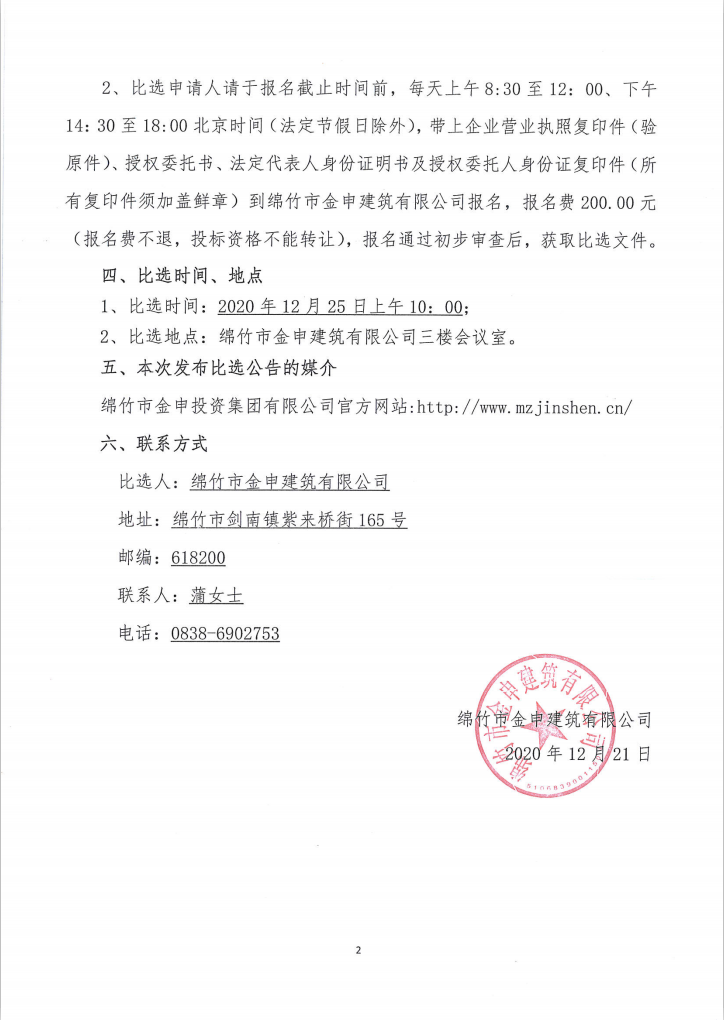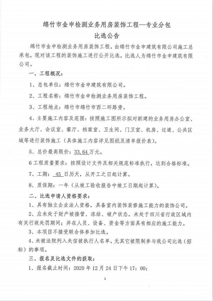 绵竹市金申检测业务用房装饰工程——专业分包比选公告