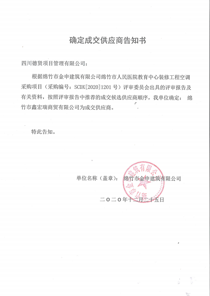 确定成交供应商告知书