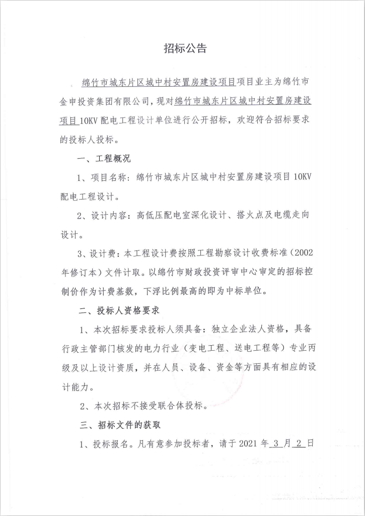 城东片区城中村安置房建设项目10KV配电工程设计招标公告
