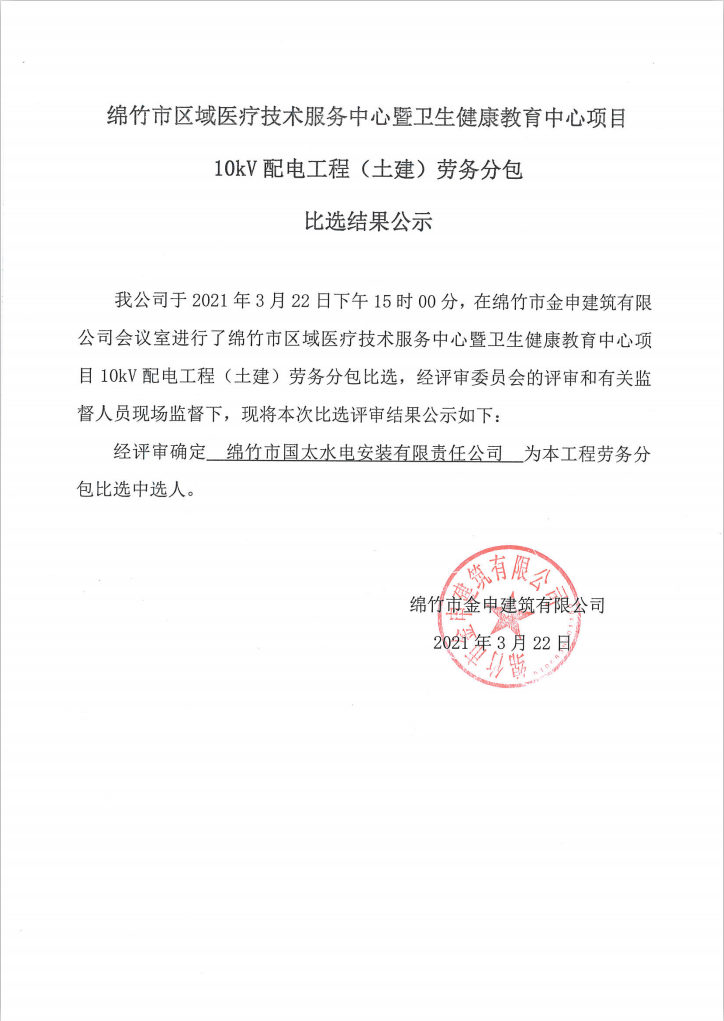 教育中心项目10KV配电工程(土建)劳务分包比选结果公告