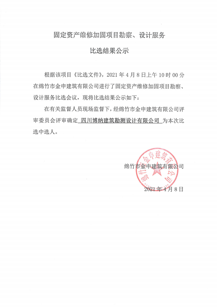 固定资产维修加固项目勘察、设计服务比选结果公示