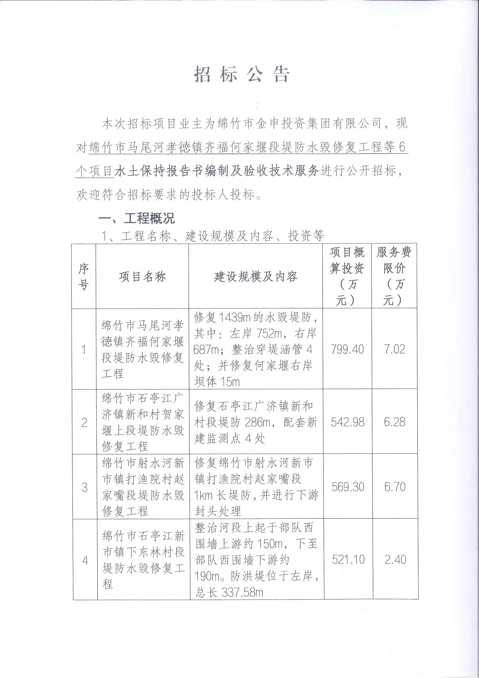 马尾河何家堰段堤防水毁等6个项目水保编制服务招标公告