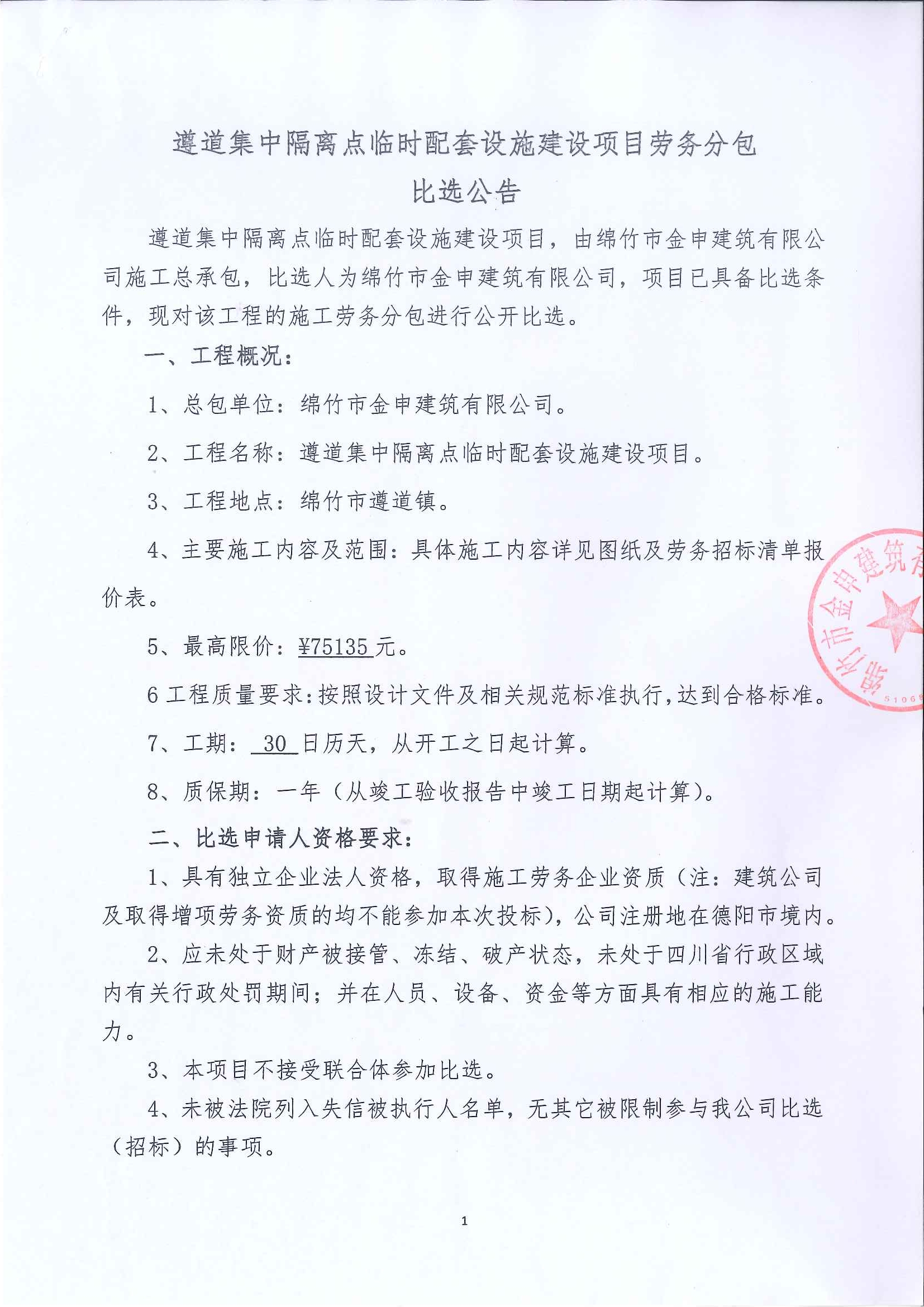 遵道集中隔离点临时配套设施建设项目劳务分包比选公告