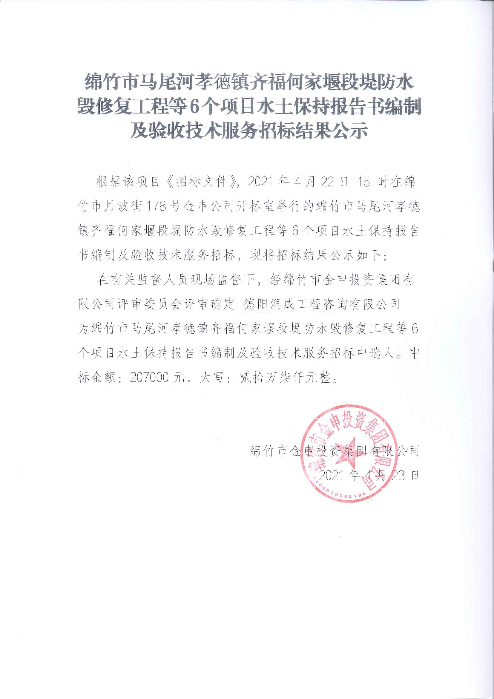 马尾河何家堰段水毁等6个项目水保编制服务招标结果公示