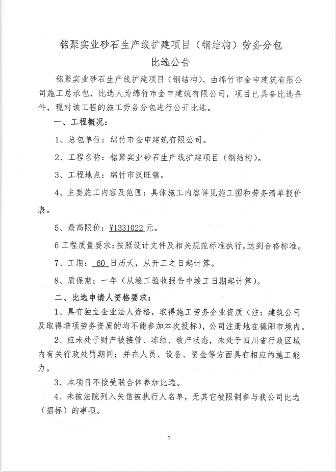 铭聚实业砂石生产线扩建项目(钢结构)劳务分包比选公告