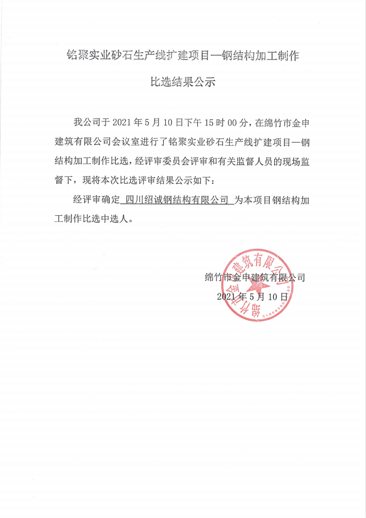 铭聚砂石生产线扩建项目—钢结构加工制作比选结果公示