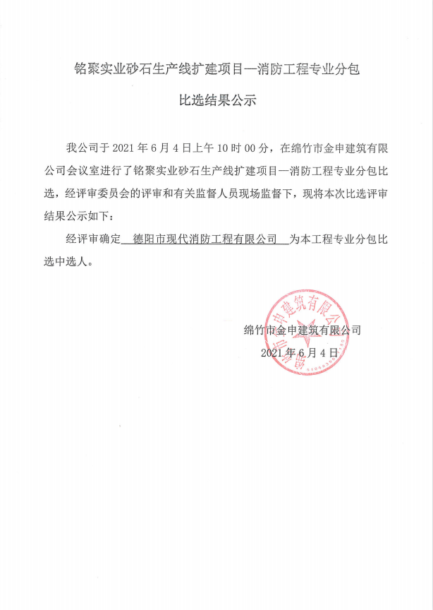 铭聚实业砂石生产线扩建项目—消防工程分包比选结果公示