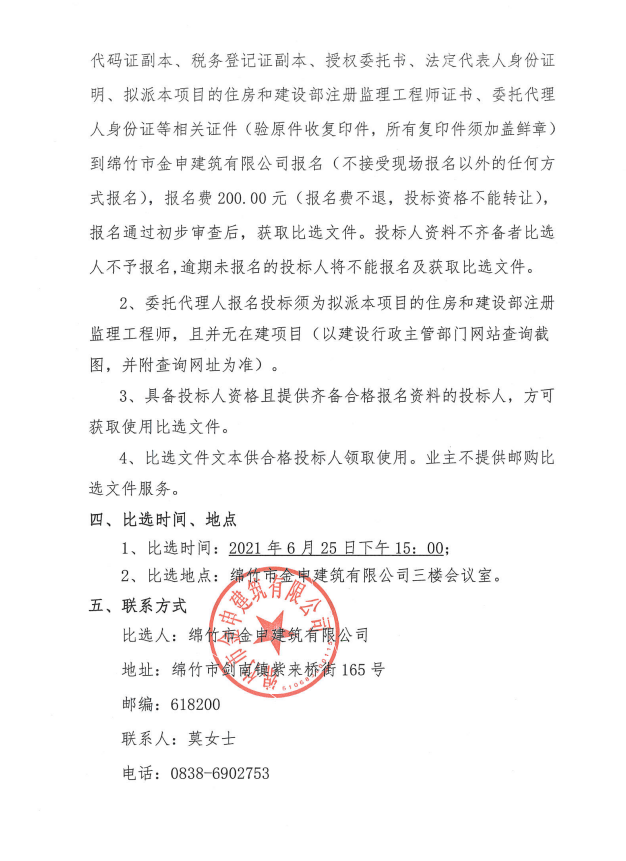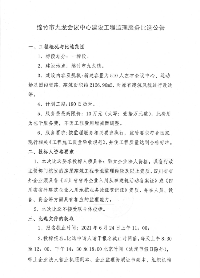 绵竹市九龙会议中心建设工程监理服务比选公告