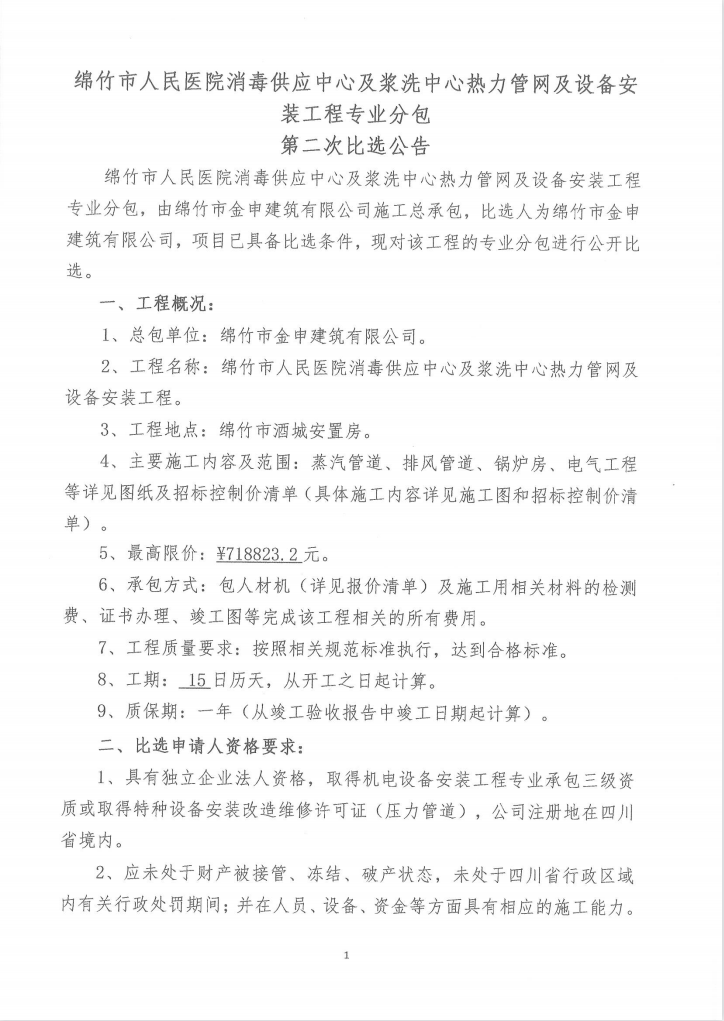 市医院消供、浆洗中心热力网管及设备安装工程二次比选