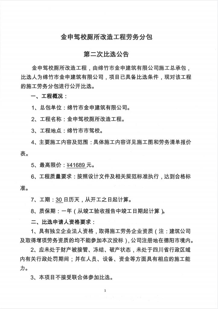 金申驾校厕所改造工程劳务分包第二次比选公告