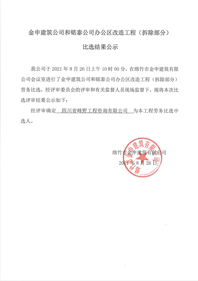 金申建筑公司和铭泰公司办公区改造工程比选结果公示