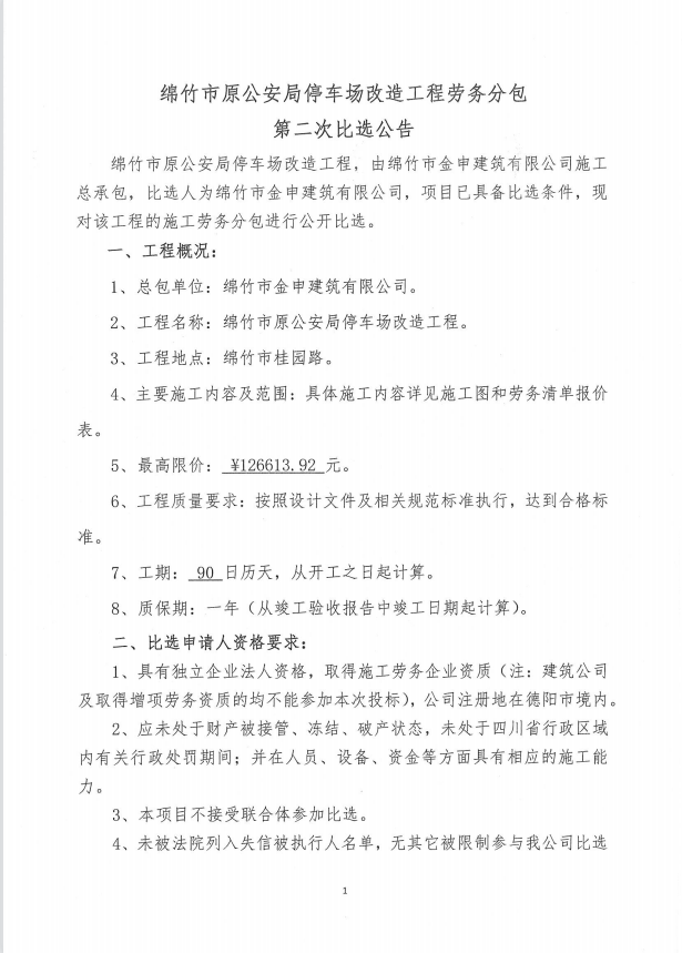 绵竹市原公安局停车场改造工程劳务分包第二次比选公告