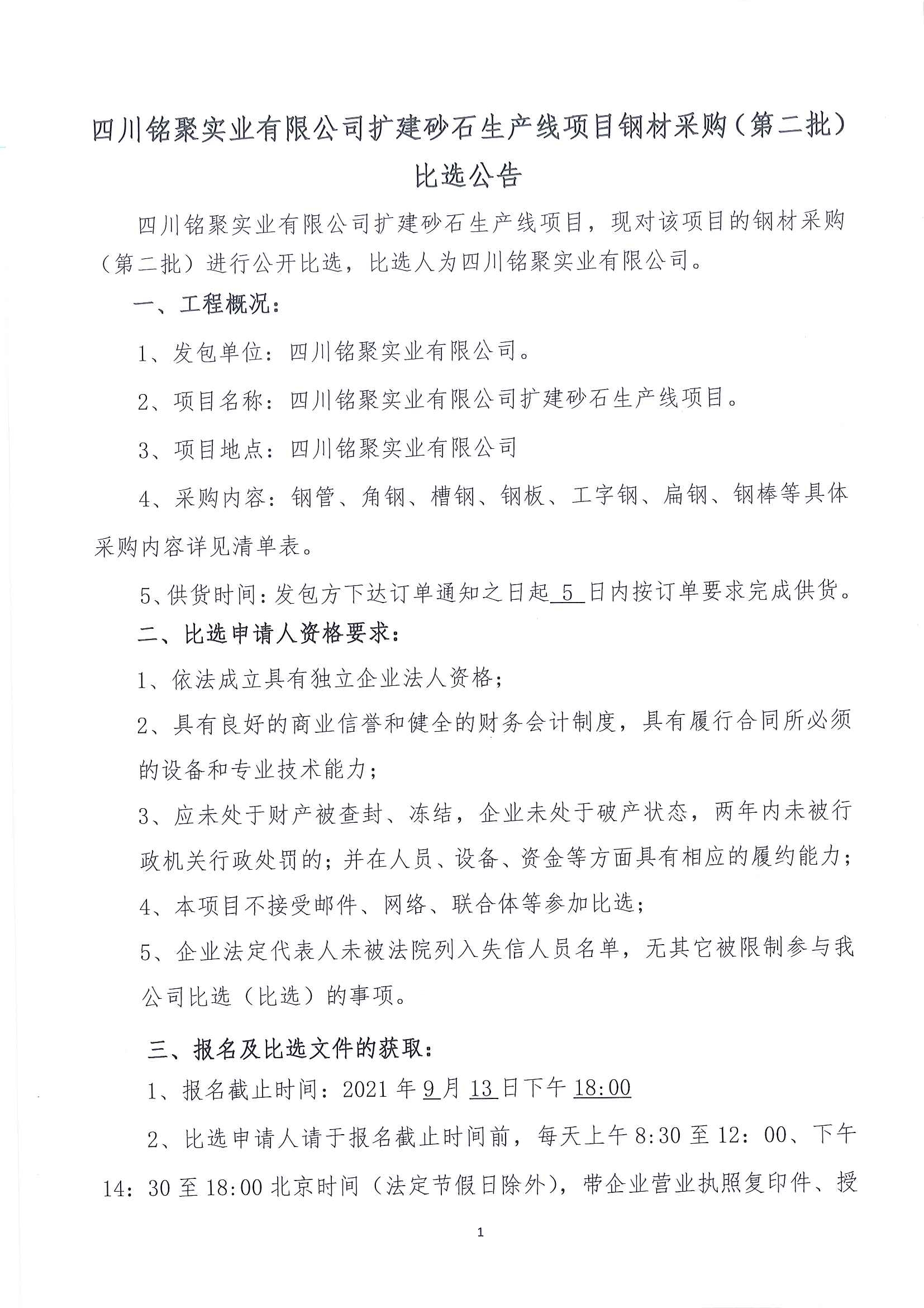 铭聚公司扩建砂石生产线项目钢材采购(第二批)比选公告
