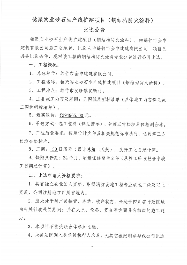 铭聚实业砂石生产线扩建项目(钢结构防火涂料)比选公告