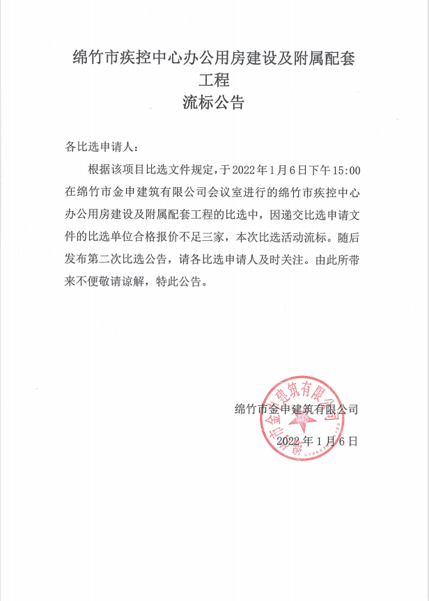 绵竹市疾控中心办公用房建设及附属配套工程流标公告