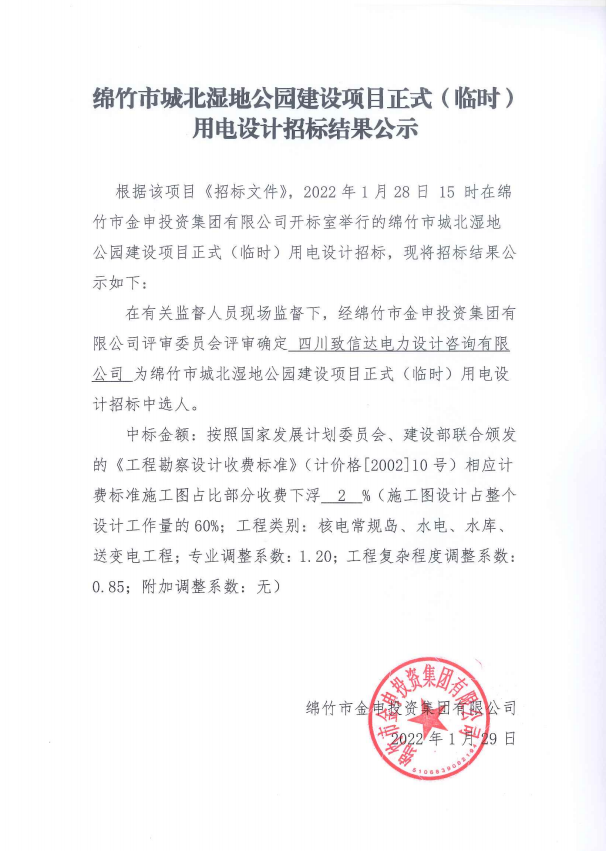 城北湿地公园项目正式(临时)用电设计招标结果公示