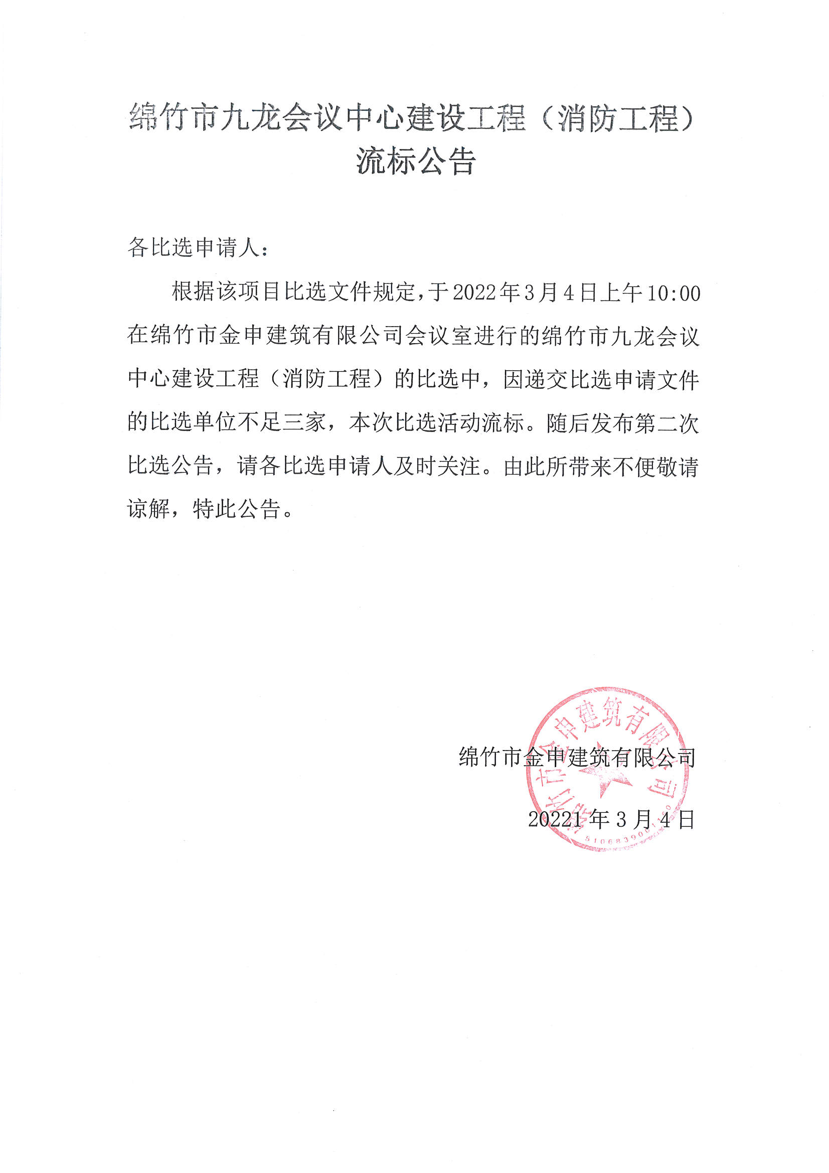 绵竹市九龙会议中心建设工程(消防工程)流标公告
