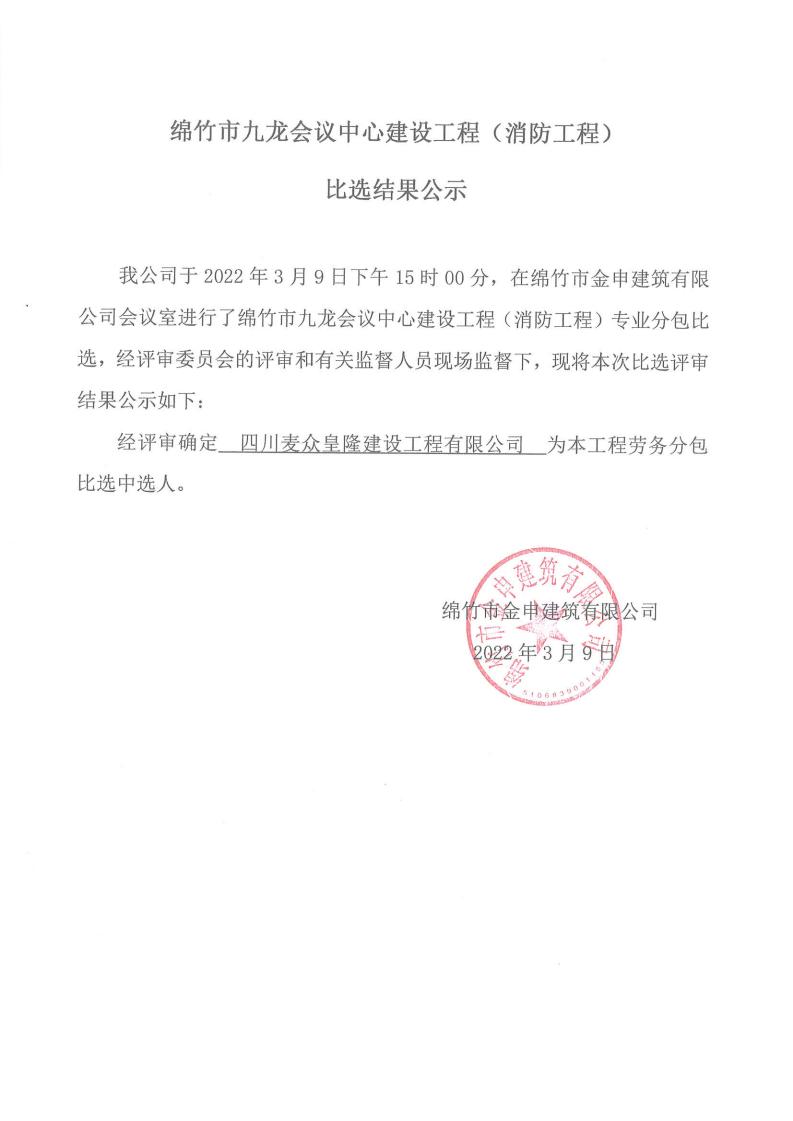 绵竹市九龙会议中心建设工程(消防工程)比选结果公示