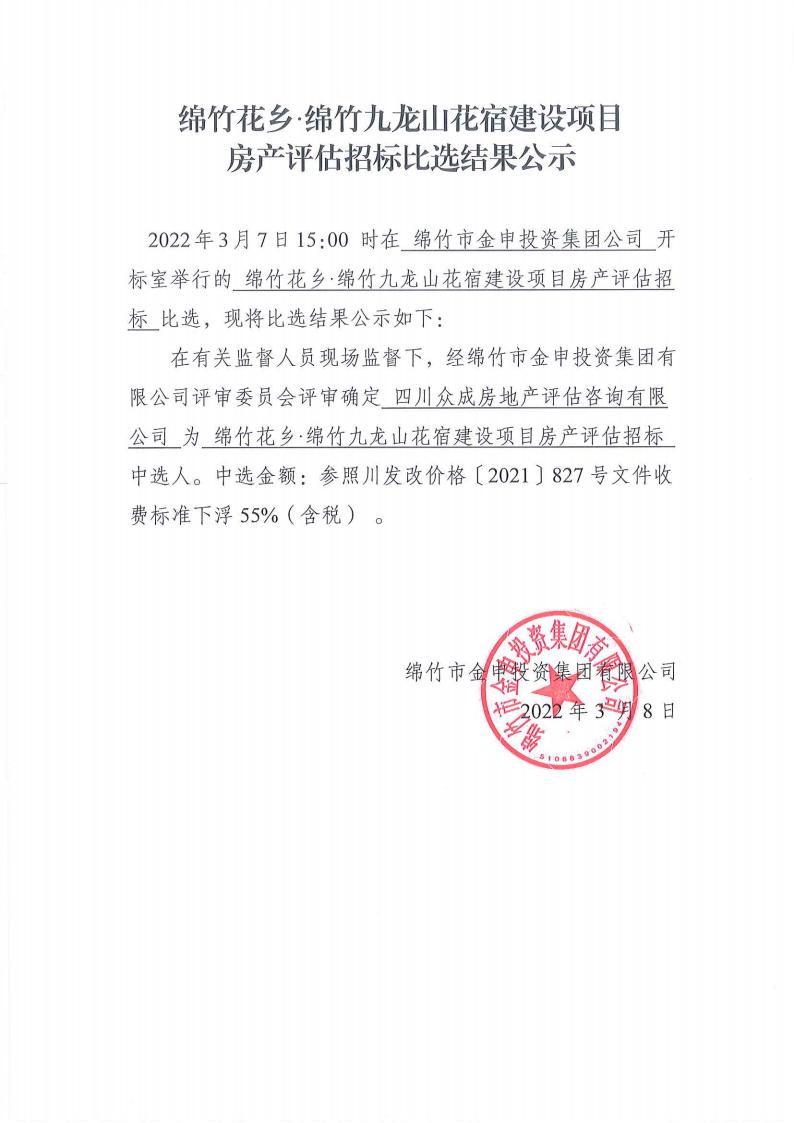 绵竹花乡·绵竹九龙山花宿房产评估招标比选结果公示