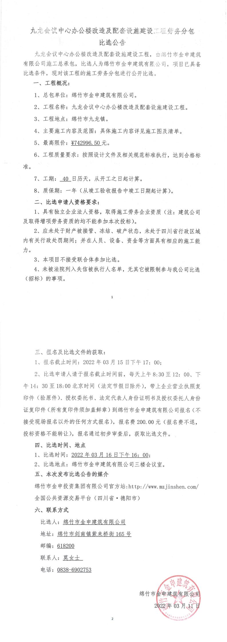 九龙会议中心办公楼改造及配套设施建设工程比选公告