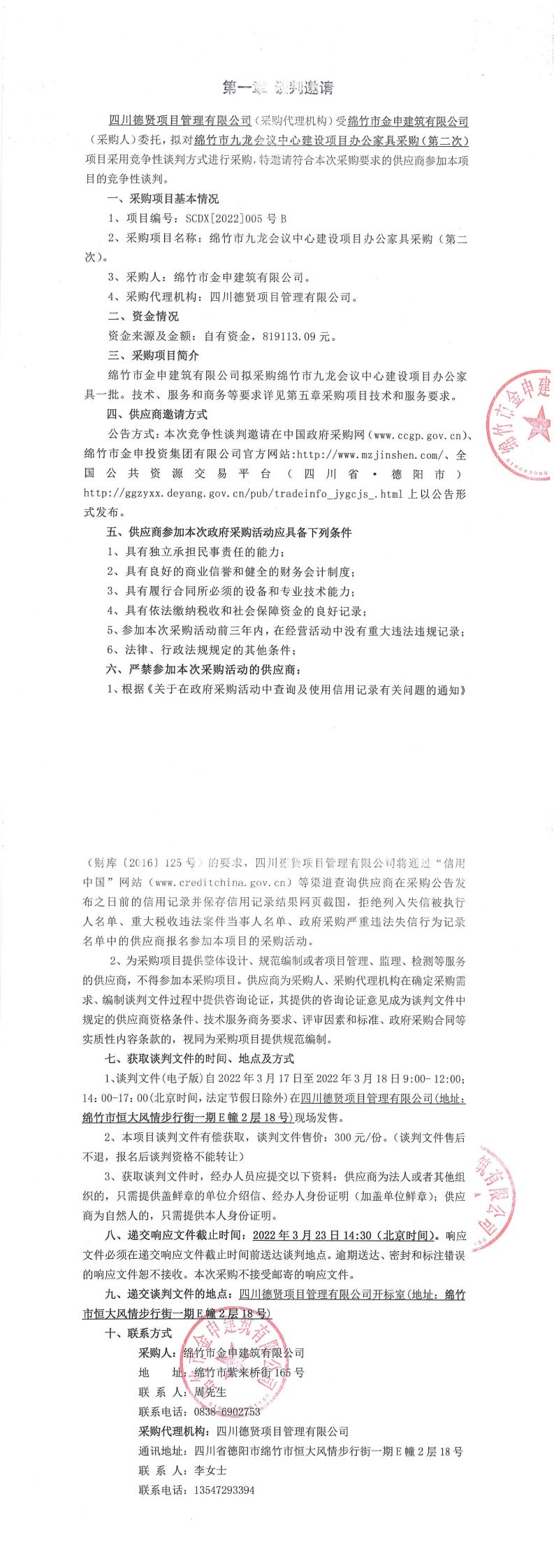 九龙会议中心项目家具采购(第二次)谈判邀请公告